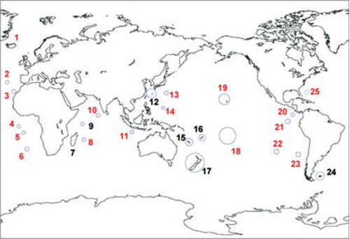 研究室のRさんもKさんもサンプリングに世界のいろいろな島を訪れているみたいです。私は出不精なので、今後、そんなにたくさんの島を訪れないとは思うのですが、いろいろ思いをめぐらすだけでも楽しいものです。 考えてみれば、地球上の7割が海なので、陸地…