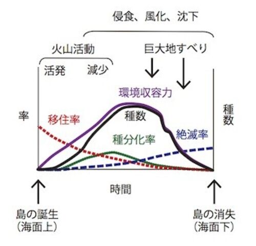 Whittakerらの「海洋島の生物地理学における一般動態理論」は、生態学ではよくある研究の流れにのって提案されたものでした。 Emerson & Kolm (2005) は、ネイチャー誌上で、ハワイやカナリア諸島において種数の多い島ほど単島固有種率が高いことを明らかに…